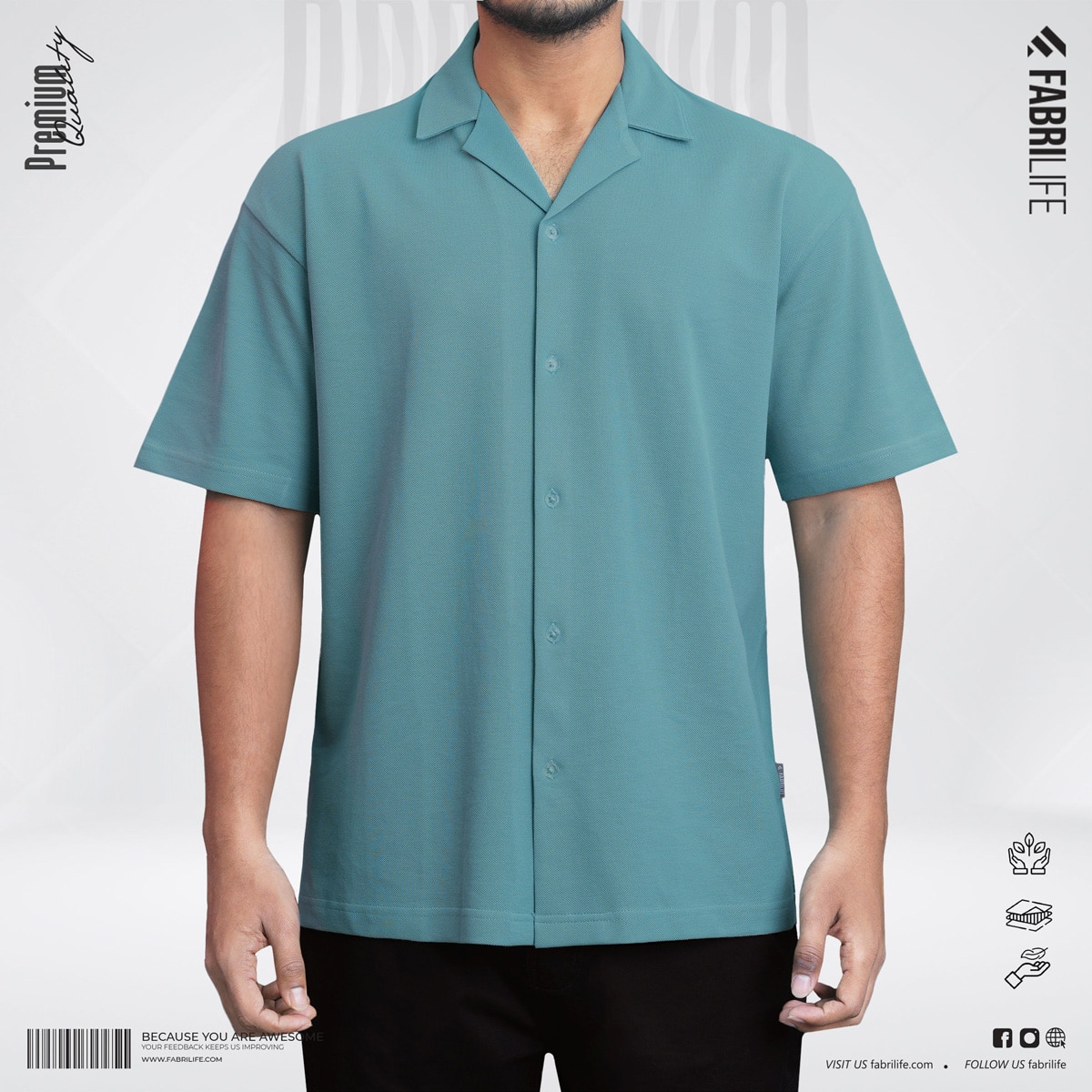 - Turn-down collar, classic button placket.
